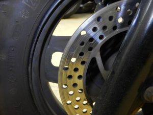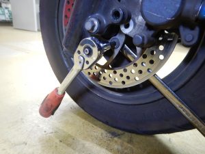 今回のバイクは125ccの小排気量車でホイールサイズも10インチと小さいので、ブレーキディスクの固定ボルトがホイールセンターからかなり近い。