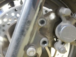 フロントのブレーキキャリパーを固定しているボルトを取り外し 、