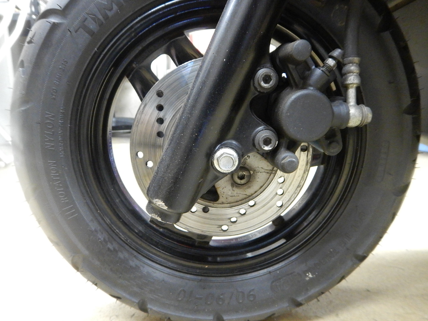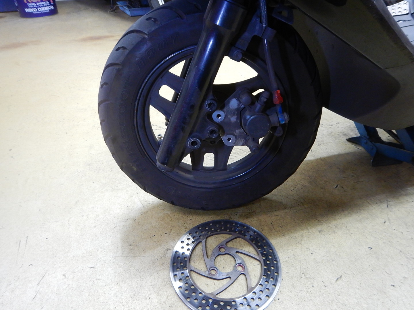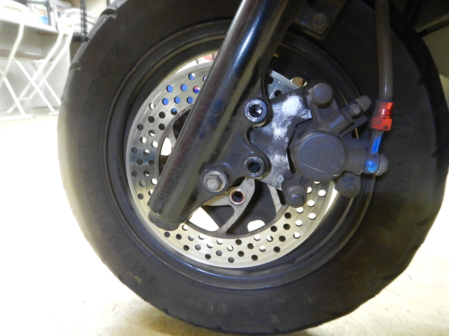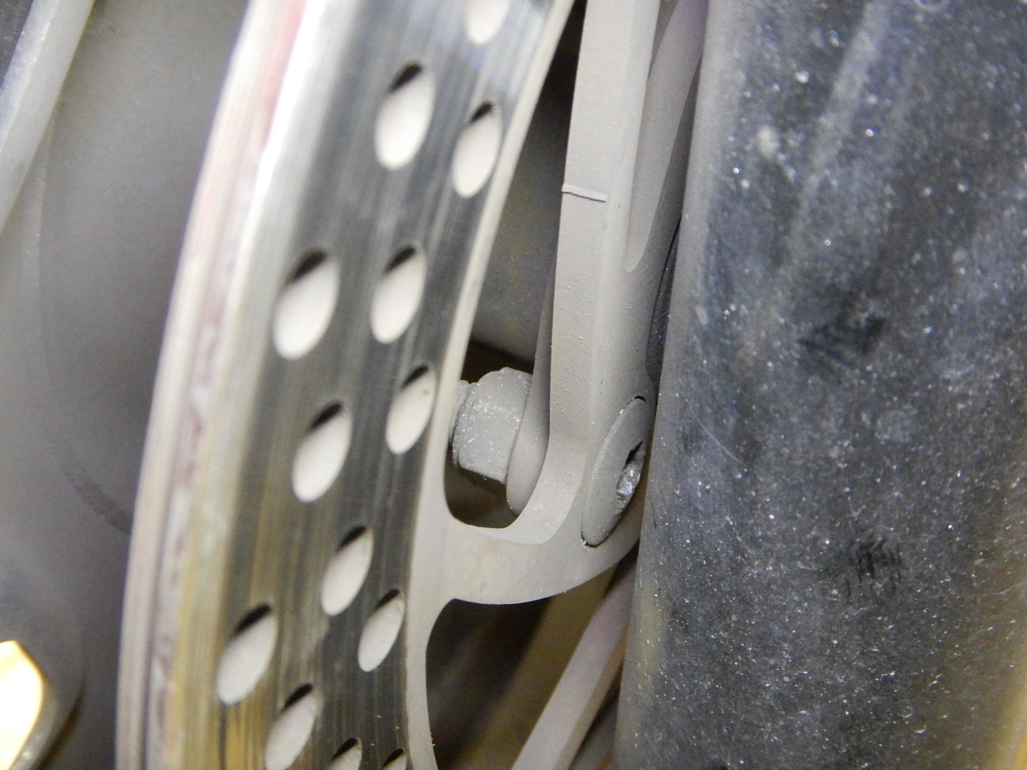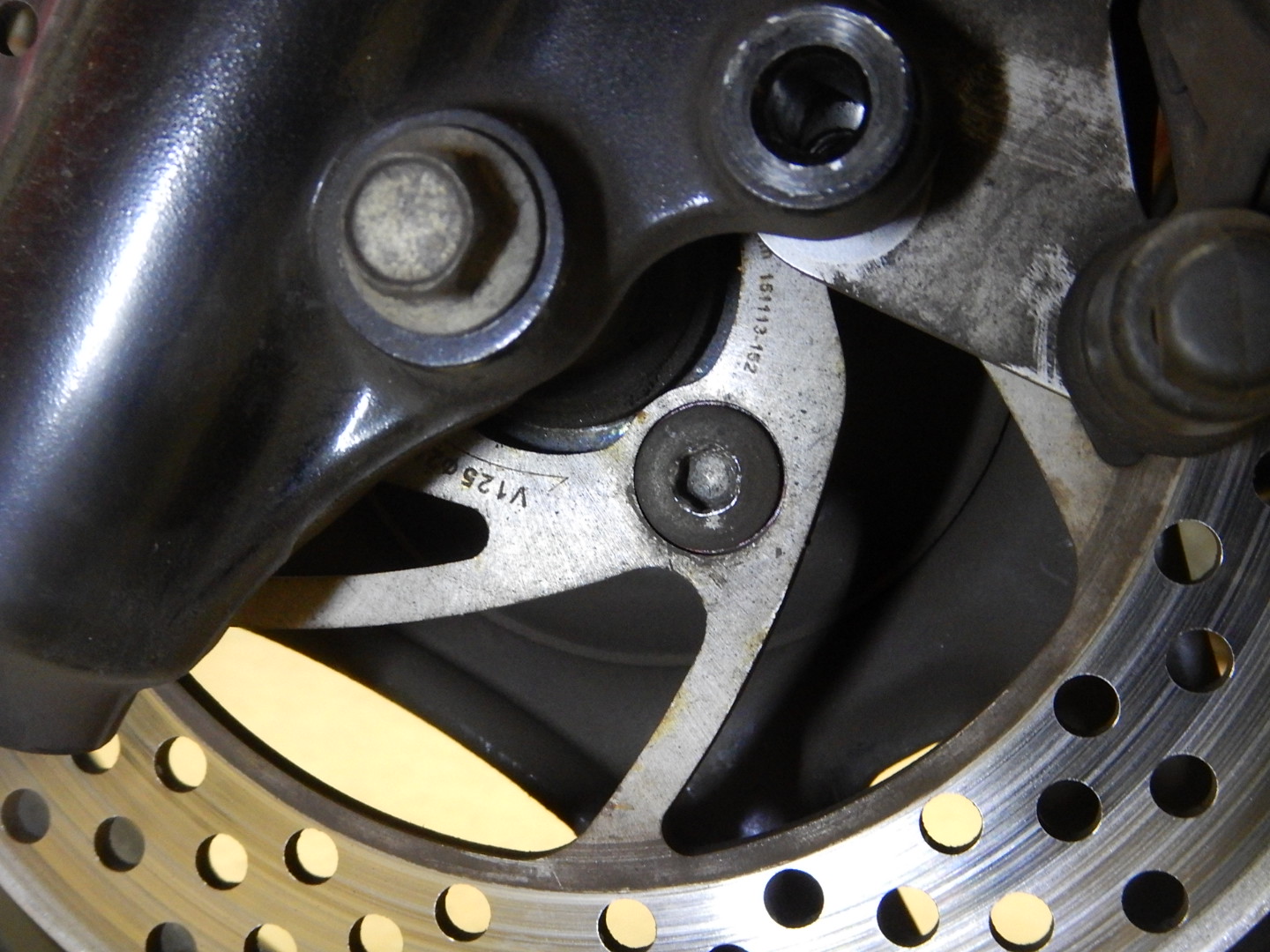 今回のバイクは125ccの小排気量車でホイールサイズも10インチと小さいので、ブレーキディスクの固定ボルトがホイールセンターからかなり近い。