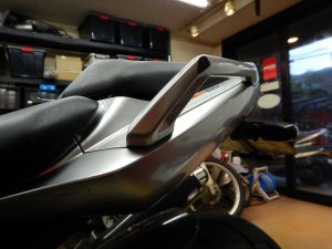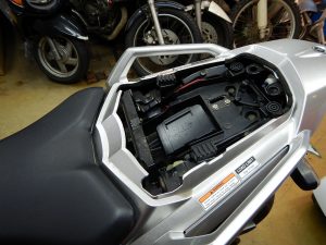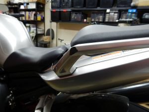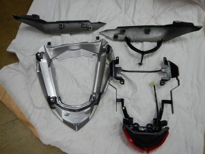 そして前側のシートも外してから、テールカウルの上側と下側を丸ごと車体から取り外します。