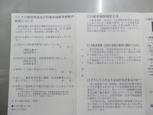 自賠責保険についての説明や注意喚起、そしてバイクの使用状況や現在の自賠責保険の状態についてのアンケート的な内容。
