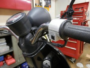 ブレーキレバー、ブレーキスイッチ、アクセルワイヤー、そしてスタータースイッチの配線。
